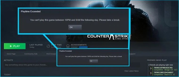 此外,在中国运营的网络游戏上常见的防沉迷系统,也会和Steam中国捆绑。Win.gg曾尝试启动《反恐精英:全球攻势》(CS:GO)和《DOTA2》,但都失败,原因是时间不在规定的游戏时长范围之内,而账户也未通过实名认证。Steam上出现的警告显示,在晚上10点到早上8点期间不能进行游戏,并建议玩家“休息一下”。