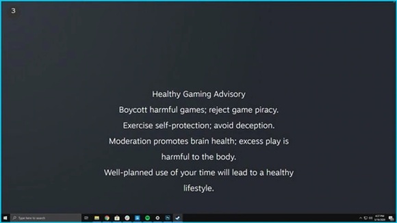 Win.gg在测试中国版Steam时,发现每次开启游戏都会出现“健康游戏忠告”,根据系统语言,提供中﹑英两个版本。该忠告会在游戏中维持5秒,主要是提醒玩家要节制游戏,以及抵制不良游戏。