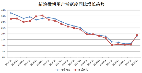 2020年Q1新浪微博月活用户数同比增加18.28%至5.5亿,日活用户数同比增加18.72%至2.41亿。用户活跃度同比增幅在该季度增长较多,但仍没有达到其2018年上半年之前的增长水平。而据抖音发布的《2019年抖音数据报告》,截至2020年1月,抖音日活用户同比增长60%至4亿。