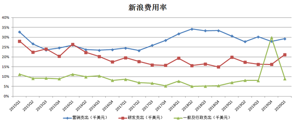 新浪的三大费用支出中,研发费用率自2016年Q2开始一直低于营销费用率。同时,自2018年Q1起,其研发支出同比增幅总体呈下降态势。