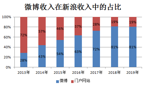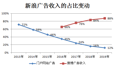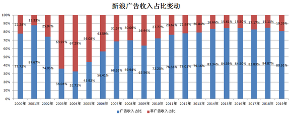 在过去的20年里,新浪从门户起家、靠微博业务立足,但即便成功过完成从门户向微博转型,新浪的变现方式没变——广告收入常年占据着它50%以上的营收来源,近6年则升至80%以上。