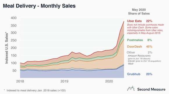 过去两年美国外卖送餐的市场在不断扩大,四大平台的市场份额也在不断扩大。从市场研究机构Second Measure的统计显示,按照销售额计算,今年5月份,DoorDash在美国外卖市场的份额已经达到了45%,Grubhub和Uber Eats份额基本相当。目前四大平台的市场份额总和已经达到了98%,基本完成了市场洗牌。