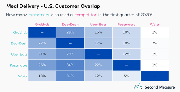 此外,四家平台的用户也存在着部分重合。显然,美国消费者也不会死守着一家外卖平台,至少会同时安装两个外卖应用。Second Measure今年第一季度的数据显示,DoorDash有22%的用户也在用GrubHub,Uber Eats有29%的用户也是DoorDash的用户。如果Uber Eats收购Postmates,只能得到后者78%的用户,因为Postmates本来就有22%的用户是Uber Eats用户。