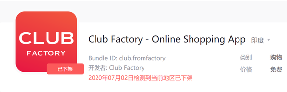 除了在印度拥有广大用户基础的社交、短视频和工具应用,几款电商应用也出现在了被禁名单中,比如杭州嘉云的Clubfactory和南京希音的SHEIN。他们目前都已从谷歌商店下架,但已下载的app依然能用。