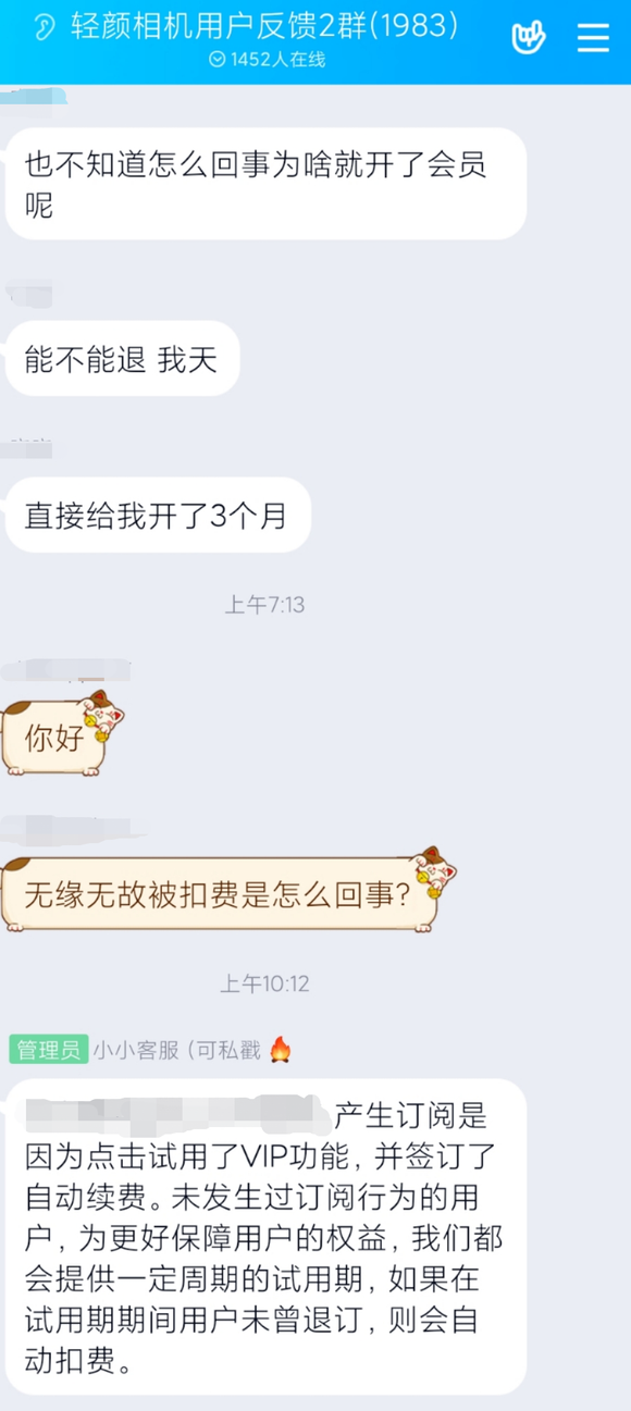 笔者记者在加入到轻颜相机客户反馈的qq群后发现,很多用户都在qq群里讨论自动扣费的问题,并纷纷表示对于订阅会员和自动扣费并不知情。而群内的客服则回复称,扣费是因为在试用的时候会和支付宝/微信签约免密支付协议,试用期到期前24小时会自动扣费。
