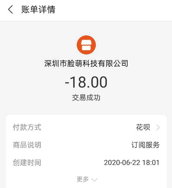 大约一周前,郑州的苗女士偶然看到支付宝的账单提醒,有一笔18元的付款记录,显示为深圳市脸萌科技有限公司对其账户开启了预授权自动续费功能,并已经在6月下旬支付三个月会员费,共计18元。