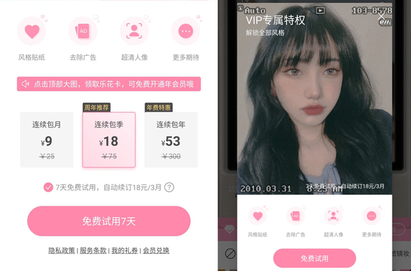 笔者记者在使用轻颜相机App发现,在点击VIP页面时,在“免费试用7天”按钮上面,有显示“7天免费试用,自动续订18元/3月”的标识,但是在拍照页面选择点击一个VIP滤镜时,却突出显示了“免费试用”的按钮,仔细观察后才发现在照片右下角也用小字标记了“7天免费试用,自动续订18元/3月”的标识。