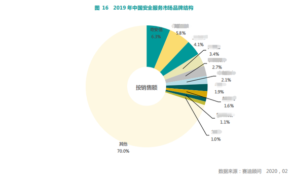 随着安全即服务理念的不断深入,安全服务市场持续增长,2019 年增速 24.2%,达到 73.4 亿元的市场规模。其中,奇安信以 6.3%的份额领跑市场,位居安全服务市场第一位。