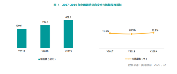 赛迪顾问认为,2019 年国内网络安全政策法规持续完善优化,“等级保护2.0”出台并开始实施,网络安全市场规范性逐步提升,政企客户在网络安全产品和服务上的投入稳步增长,云安全、威胁情报等新兴安全产品和服务逐步落地,自适应安全、情境化智能安全等新的安全防护理念接连出现,为我国网络安全技术发展不断注入创新活力。随着国家在网络安全政策上的支持加大、用户需求扩大、企业产品的逐步成熟和不断创新,网络安全市场保持快速增长,规模达到 608.1 亿元,同比增长22.8%。