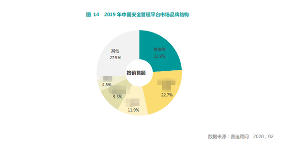在安全管理平台市场,随着客户对网络安全统一安全管理的需求逐渐爆发,安全管理平台市场 2019 年增速达到 32.9%,市场规模达到 24.3 亿元。其中,奇安信凭借近几年在安全管理平台方面的发力,发展了很多大客户,市场排名第一,占有率达到23.9%。