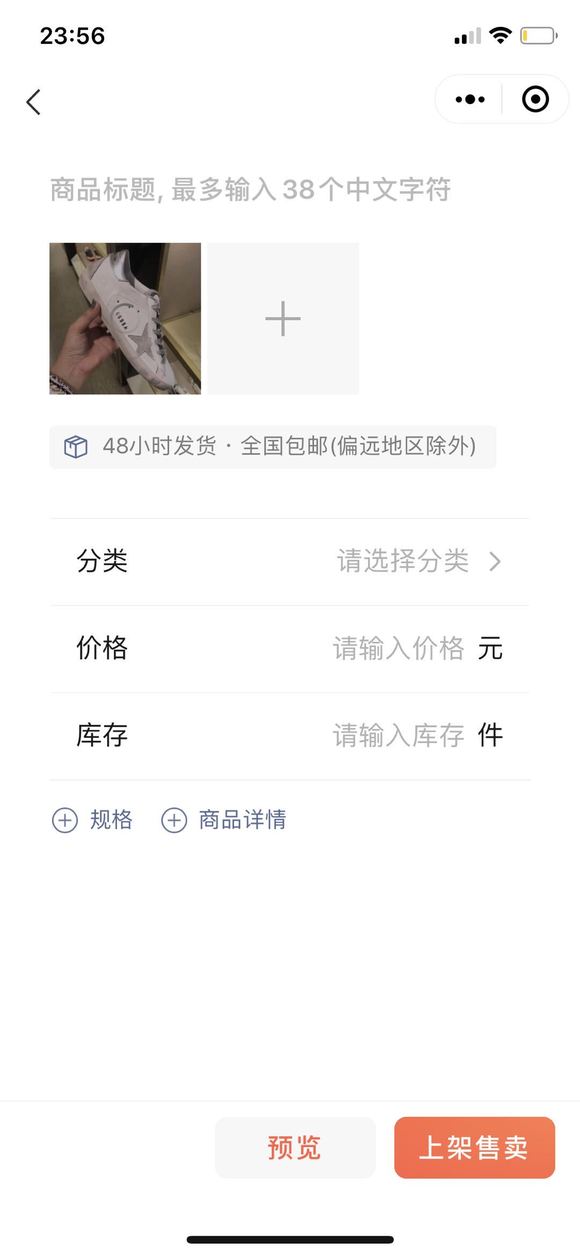 在商品详情页面,可进行商品标题、分类、价格、库存、规格等介绍,最多可上传18张商品图,暂不支持视频展示。在商品信息填写完毕后,需要经过一段时间的审核流程才能正式上架。目前微信对于商品的审核仍然较为谨慎,审核时间为1-3天,且暂不支持虚拟商品的交易。