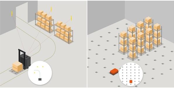 同一时期,为了解决导引技术不便于多机协同作业的问题,出现了地标定位技术,使得多台机器人可以在一片区域里面协同作业,适用于仓库密集存储和密集分拣的场景,而在工厂点到点运输场景还不如导引技术方便。以上两种技术可以看做第2代技术。