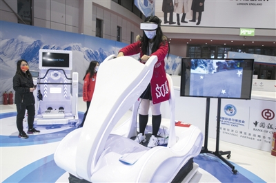 2021年11月8日,上海,第四届进博会,参观者体验沉浸式VR滑雪运动。
