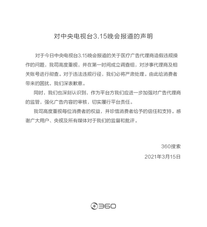 360搜索和UC就虚假医疗广告致歉,将严格清查相关违规行为 | 3.15特别报道
