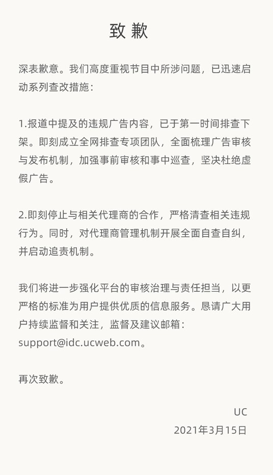 作为另一家被央视点名的UC则回应称,为违规广告带来的不良影响向公众致歉,第一时间排查下架违规广告内容,并成立全网排查专项团队,加强对广告投放事前审核和事中巡查。