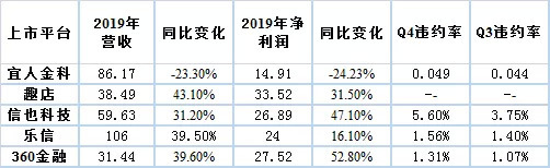 财报显示,除了宜人金科之外,另外四家第四季度的业绩都开始呈现下滑趋势,且有的平台下滑幅度较大。例如,趣店2019年第四季度的总收入为19.32亿元,环比下降25.4%;按照非美国通用会计准则(Non-GAAP)调整后的净利润为1.57亿元,环比下降85.2%。