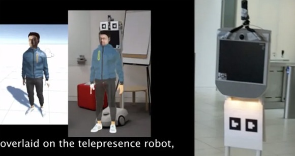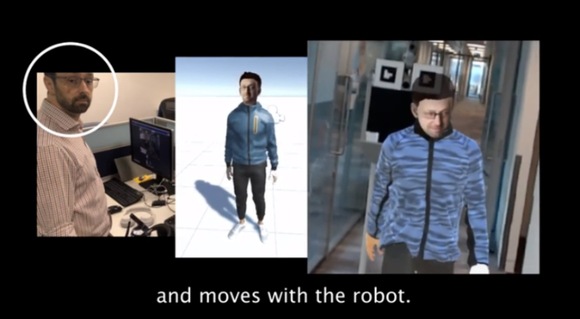 由上图可知,在本地空间内,在场工作者通过佩戴微软HoloLens AR耳机,叠加远程呈现机器人的作用,能够看到远程工作者的真人大小的“化身”以及手势动作。