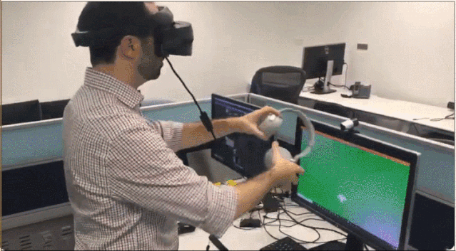 对于远程工作者来说,他的手臂及手势动作会被VR设备控制器记录,从而呈现在“化身”身上。