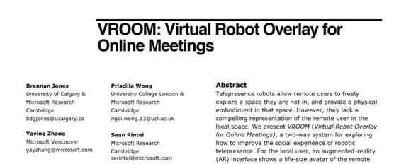 VROOM已被美国计算机学会(ACM)的计算机系统人类因素会议(ACM CHI Conference on Human Factors in Computing System)接受发表。该会议原定于上周在夏威夷举行,但由于新冠肺炎等原因被取消了。VROOM是其之前一项研究贡献的续篇,2018年,ACM CHI上就出现了Mini-Me,正是一种将化身带入会议中以进行混合现实会议和互动的方式。