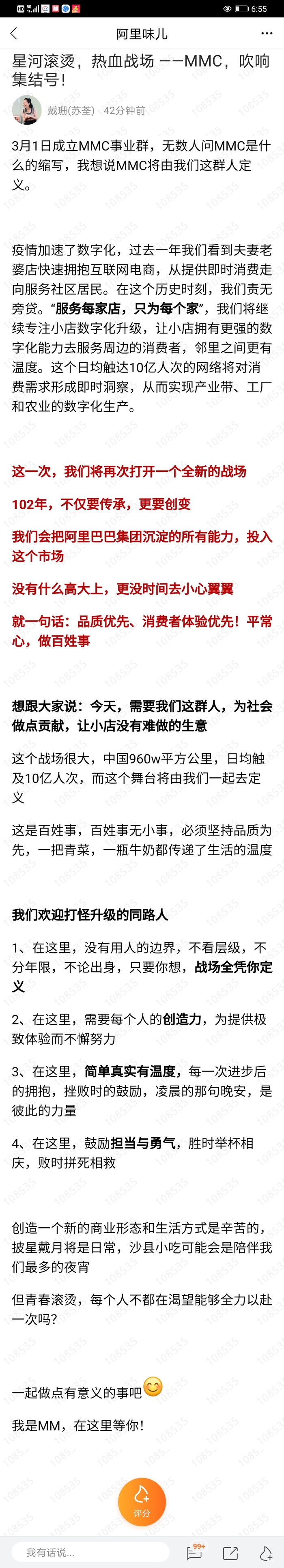 4月1日,阿里巴巴集团合伙人戴珊在公司内网发布全员公开信——《MMC,吹响集结号!》。这是阿里巴巴旗下MMC事业群成立后,负责人首次发布的公开信。