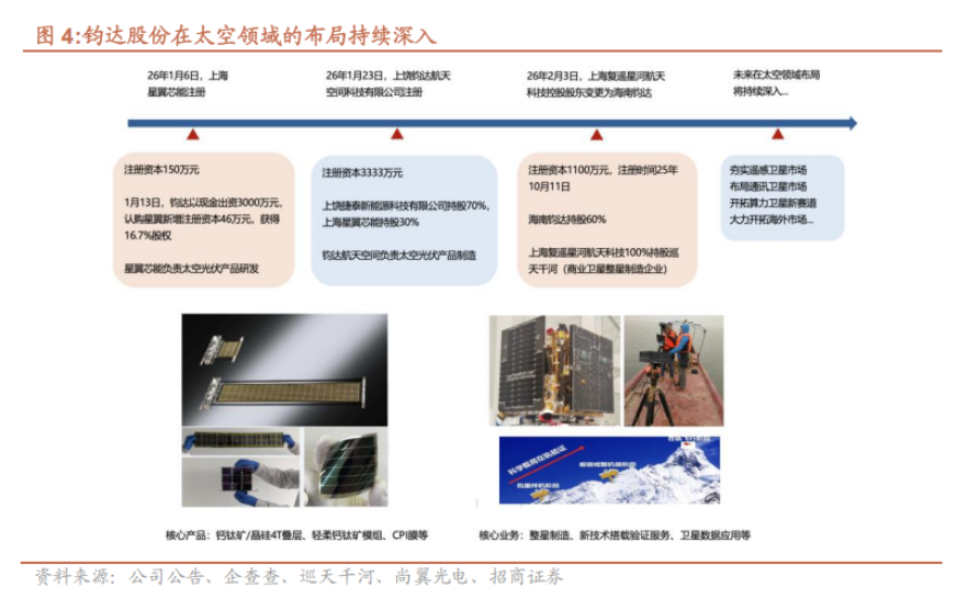 2026年1月,公司与尚翼光电/上海光机所深度合作,不仅持有尚翼光电团队创始人及创始股东新设的项目公司星翼芯能16.67%的股份,成为其第二大股东,还与其成立了钧达航天空间科技(均达持股70%,星翼芯能持股30%),专门负责CPI膜和钙钛矿叠层产品的产业化。该合资公司在太空能源应用领域有较深积累,有望快速进入国内外大客户体系。